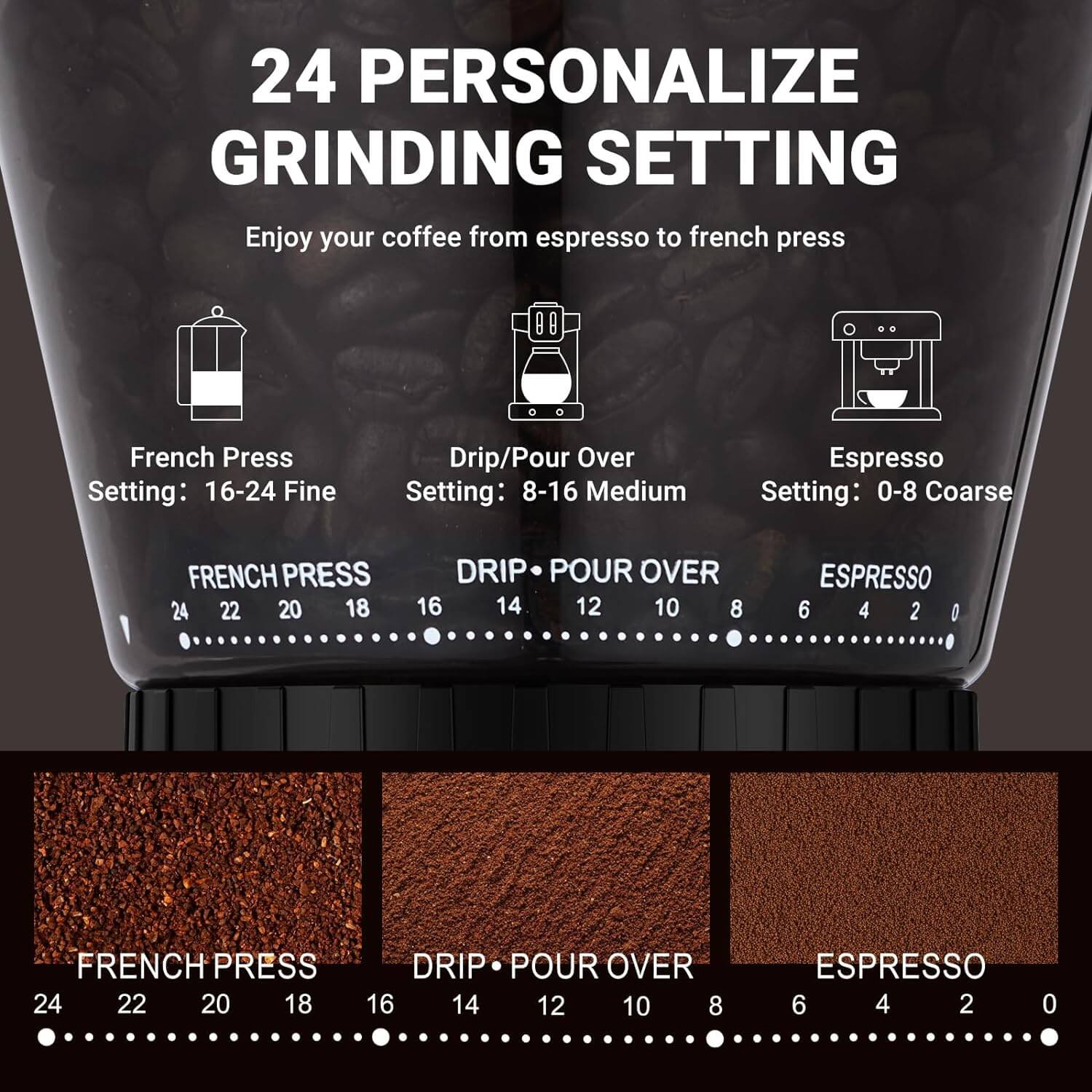 48 Precision Grind Settings: This coffee bean grinder comes with 48 adjustable settings that ensures consistently uniform grounds for any brew method. Whether you're craving a rich French press, a bold espresso, a smooth filtered coffee, or a robust Turkish coffee, you can dial in your preferred grind in mere seconds. From coarse to fine, all options are at your fingertips – one machine that perfectly caters to the grinding needs of every coffee style