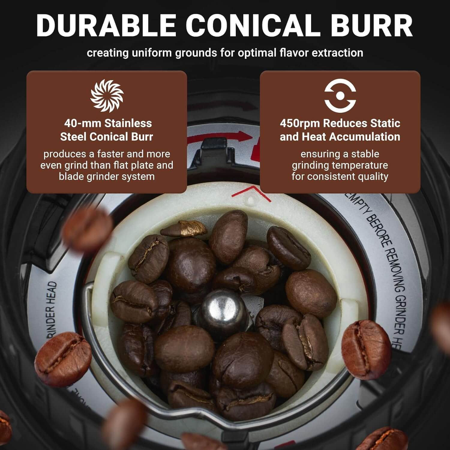 74mm Stainless Steel Conical Burr: The conical burr design ensures even pressure on coffee beans during grinding, preventing extraction issues (over/under-extraction) caused by uneven particle size. At the same time, it preserves delicate oils for optimal flavor. With a low-speed grinding rate of 450 RPM, heat and static buildup are minimized. This maintains a stable grinding temperature and delivers consistent, high-quality coffee