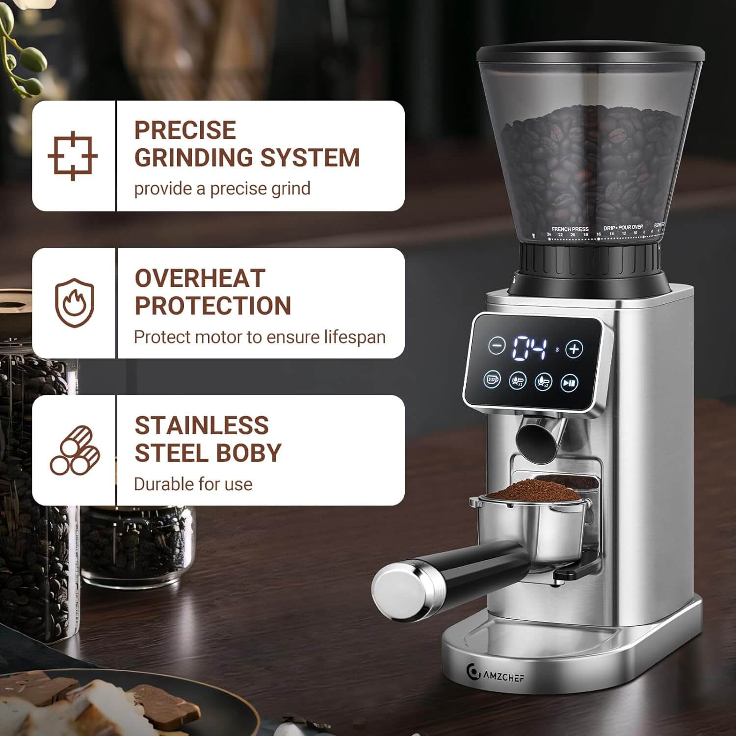 300g Bean Hopper Capacity: AMZCHEF burr coffee grinder features an anti-static container that holds up to 300g of coffee beans - ideal for high-volume brewing. Coffee grinder with scale can quickly grind large amounts of coffee beans if you have a high need for coffee. The brown-coloured funnel of the coffee grinder electric can protect the coffee beans from UV rays to keep them fresh and tasty